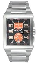 Quartz movement, Dress watch, Chronograph, Luminous hands, Silver-tone indices, Orange lined numbers, Orange second numbers on outer concave ring, Analog date display, Brushed stainless steel bracelet, Polished stainless steel case, crown and selector buttons, Brushed stainless steel caseback, 50 meters/165 feet water resistant